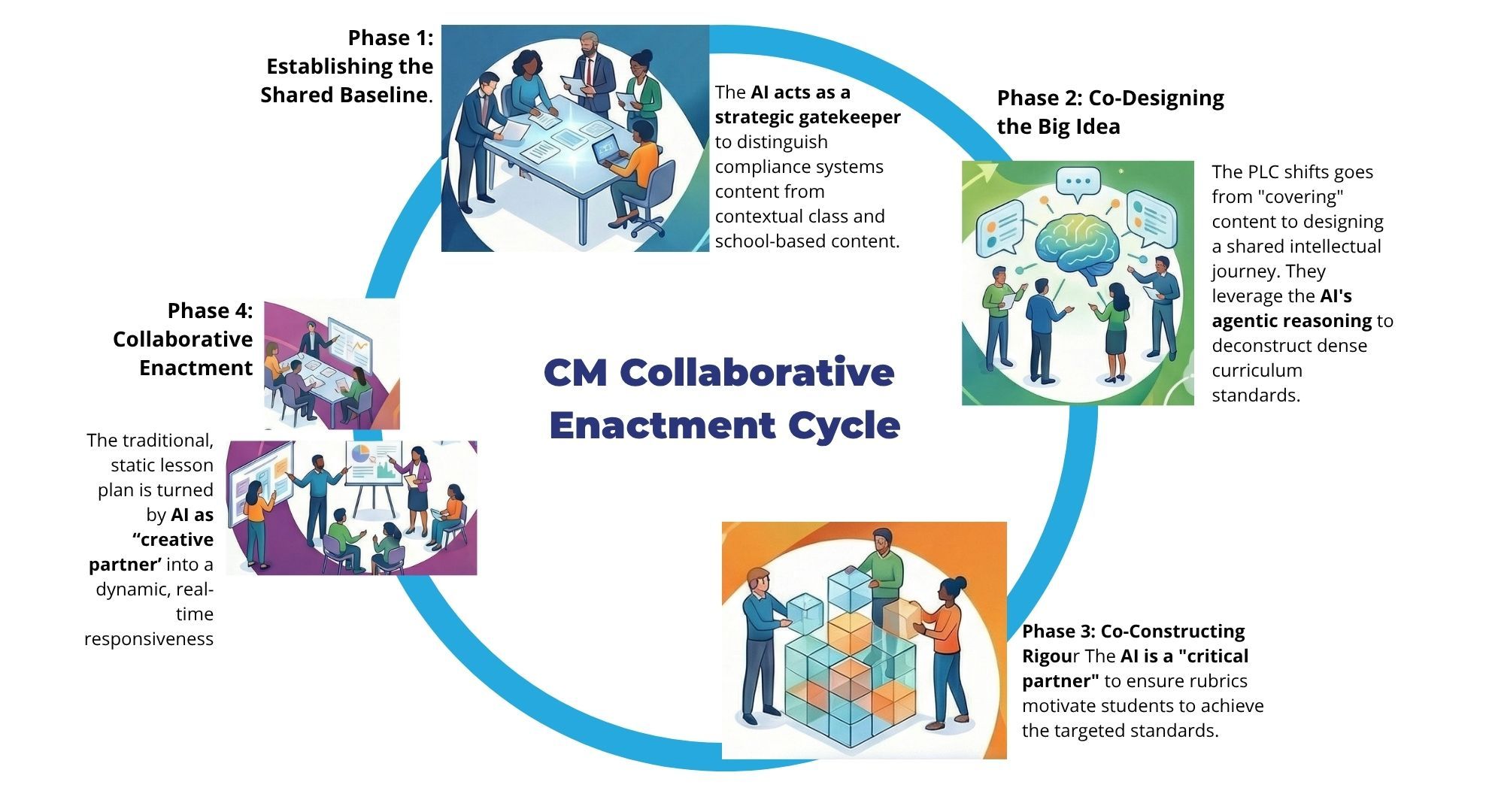 Our 4-Phase method of working with AI is all about your agency to make sure that every student makes progress. We view a Large Language Model(LLM) not as a tech tool, but as an AGENT there to support us. The 'teacher-in-the-loop' can benefit from its prodigious capability with his or her relational, ethical, cognitive, imaginative and holistic abilities.